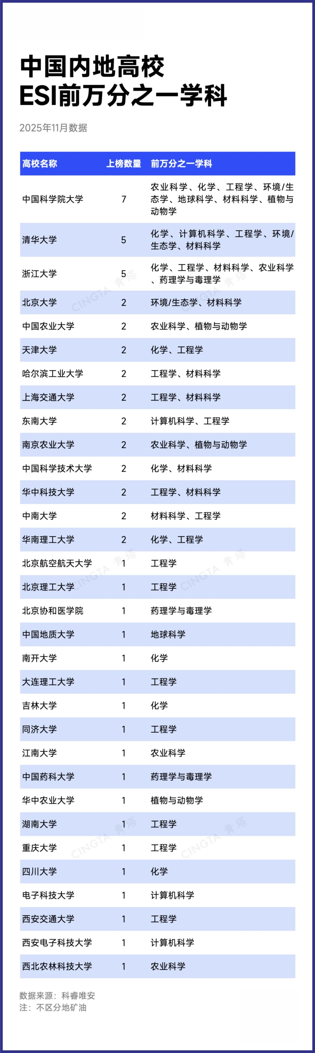 此外,共有32所高校的57个学科位列ESI前万分之一学科,其中中国科学院大学拥有7个ESI前万分之一学科,排名第一;清华大学和浙江大学紧随其后,分别拥有5个ESI前万分之一学科;北京大学、中国农业大学、天津大学、哈尔滨工业大学、上海交通大学、东南大学、南京农业大学、中国科学技术大学、华中科技大学、中南大学、华南理工大学分别拥有2个ESI前万分之一学科。