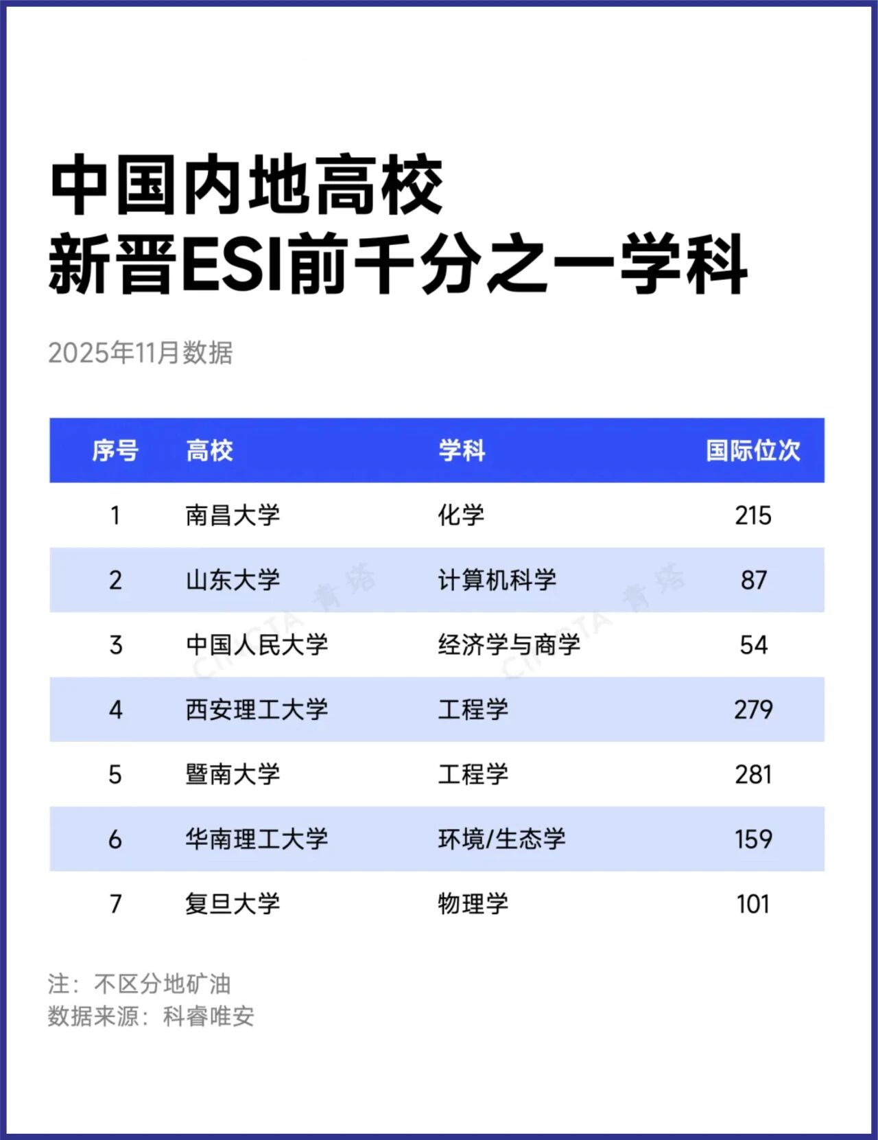 统计显示,本期同上一期相比,中国内地共有7所高校7个学科新晋ESI前千分之一学科(注:不区分地矿油),分别是南昌大学的化学、山东大学的计算机科学、中国人民大学的经济学与商学、西安理工大学的工程学、暨南大学的工程学、华南理工大学的环境/生态学、复旦大学的物理学。