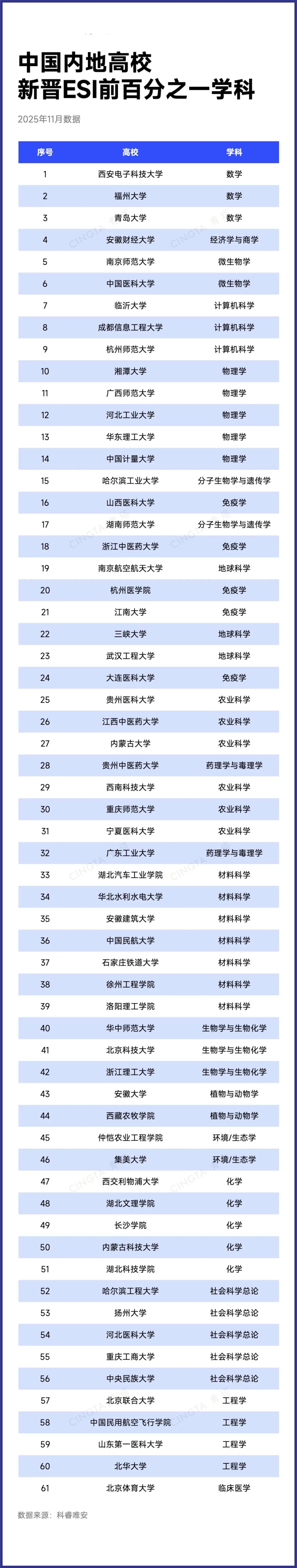 与上一期相比,本月共有61所高校共新增61个ESI前1%学科(注:不区分地矿油)。