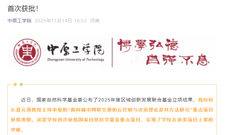 近日,国家自然科学基金委公布了2025年度区域创新发展联合基金立项结果,中原工学院校长夏元清教授主持申报的“面向城市网联交通的云控制与决策理论及其方法研究”重点项目获批资助。这是学校首次获批国家自然科学基金重点项目,实现了学校在该类项目上零的突破。