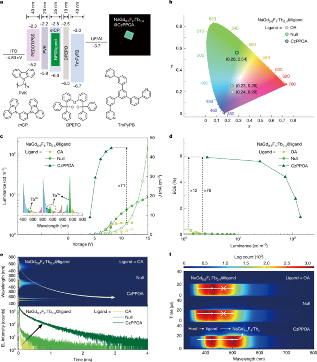图3| NaGd₀.₆F₄:Tb₀.₄@ligand器件的电致发光性能