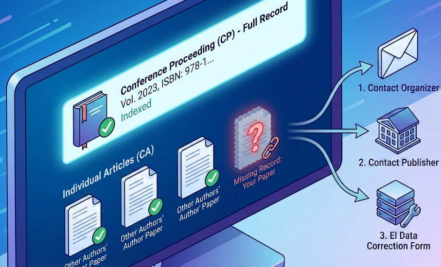 - 话术: "I found that the conference proceedings have been indexed as a whole (CP), but my specific paper [Paper ID] is missing from the database. Other papers from the same conference seem to be indexed. Could you please check with the publisher?"