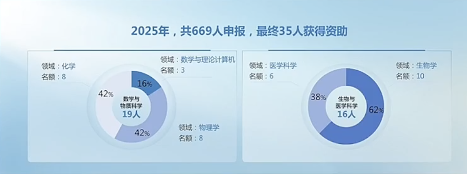 资助的领域分为数学、物理、化学和生物医学,此次受到资助的学者名单如下: