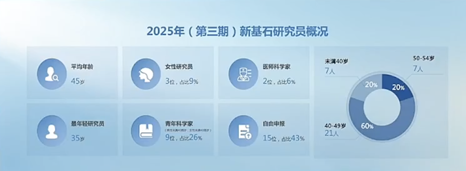 更年轻: 获资助人平均年龄45岁,为三期以来最低。其中青年科学家9位(男性未满40周岁;女性未满43周岁),占比超1/4创下新纪录;最年轻的获资助人仅35岁。