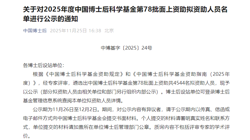11月25日,中国博士后科学基金会发布关于2025年度中国博士后科学基金第78批面上资助获资助人员名单的通知:根据《中国博士后科学基金资助规定》和《中国博士后科学基金资助指南(2025年度)》,经专家评审,遴选出中国博士后科学基金第78批面上资助共4544名拟资助人员,现予以公示(部分拟资助人员由相关单位和部门另行组织内部公示)。