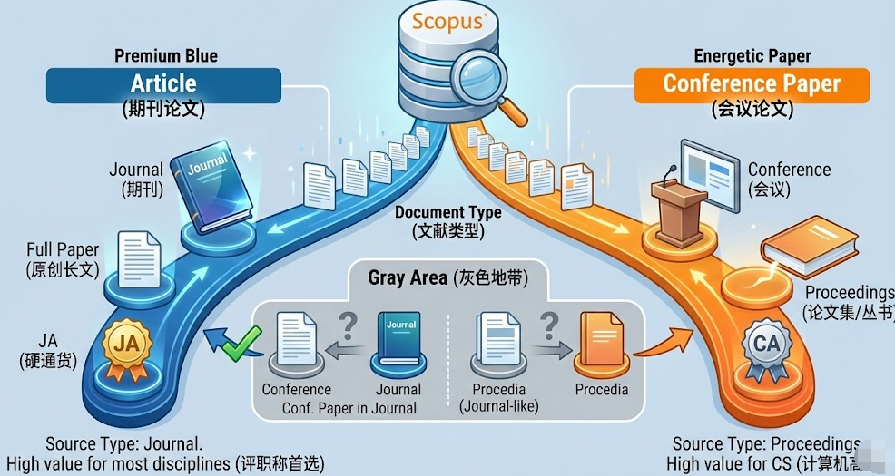 很多作者认为:“发在期刊上就是 Article,发在会议上就是 Conference Paper”。这个理解是对的,但在 Scopus 的复杂数据结构中,存在着大量的“灰色地带”。