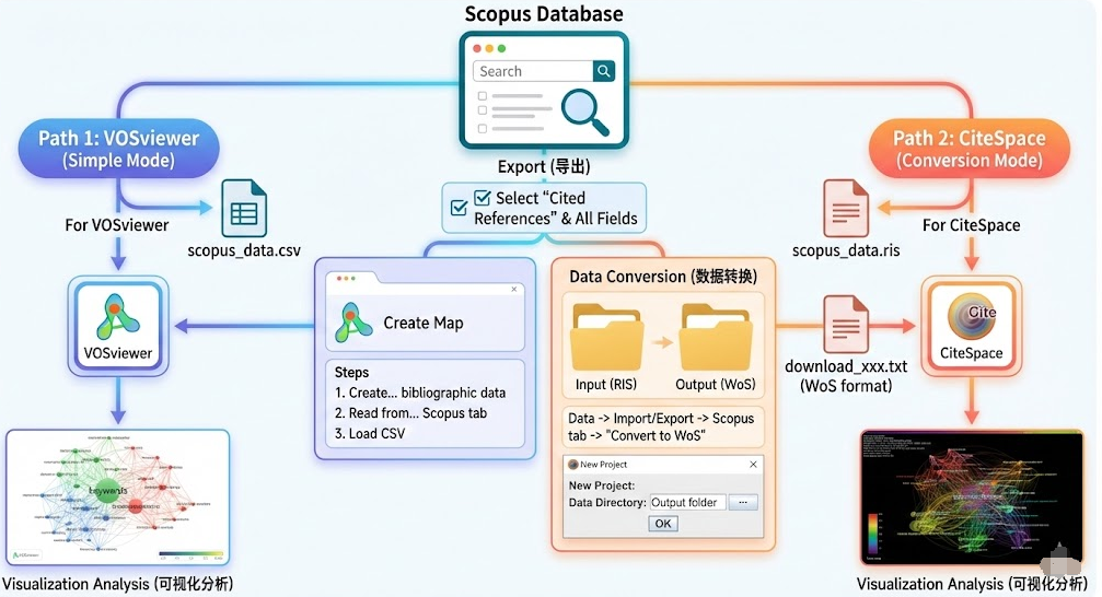核心原因在于数据格式的选择和预处理。VOSviewer 对 Scopus 比较友好,可以直接读取;而 CiteSpace 原生支持 WoS 格式,处理 Scopus 数据时需要一个**“格式转换”**步骤。