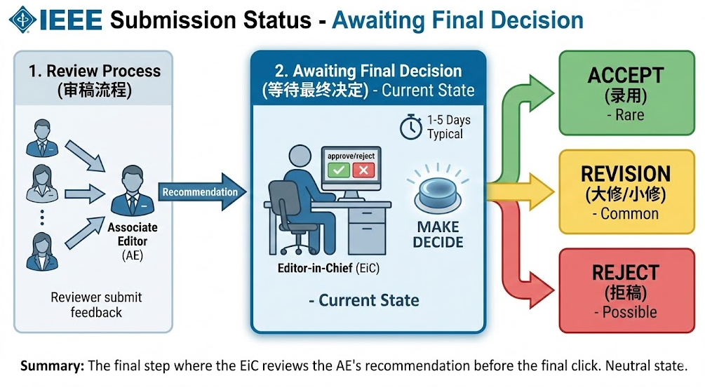 在 IEEE 的投稿系统中,"Awaiting Final Decision"(或 "Awaiting EIC Decision")是审稿流程的最后一步。