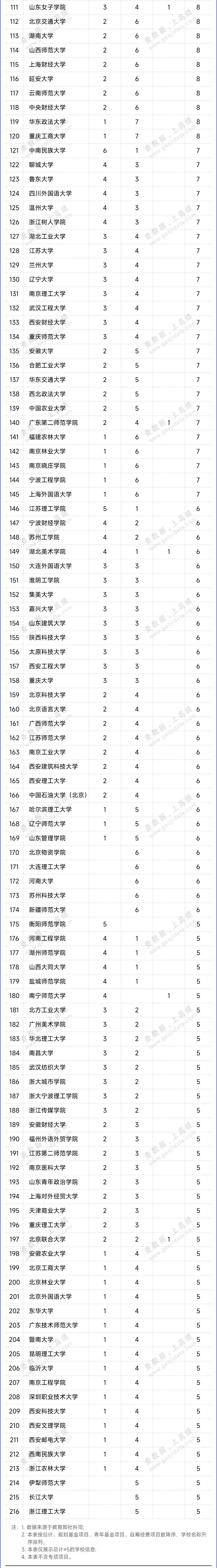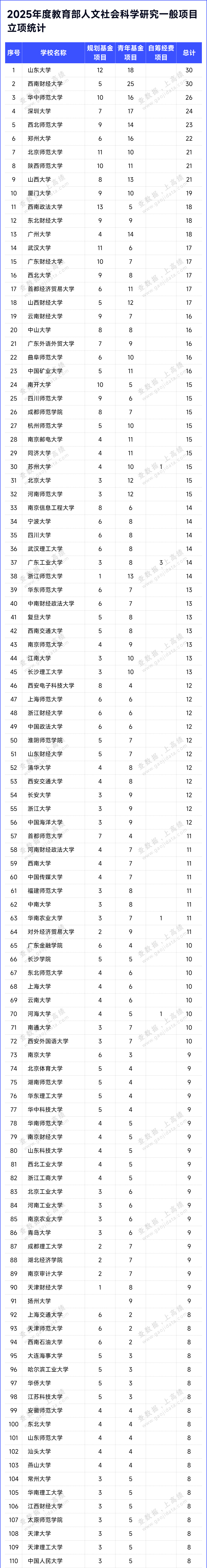 在规划基金、青年基金、自筹经费项目,西部和边疆地区项目,新疆项目,西藏项目4类项目立项结果中,山东大学、西南财经大学共30项,入选项目数并列第一;其次是华中师范大学入选26项,入选项目数量进入前三。