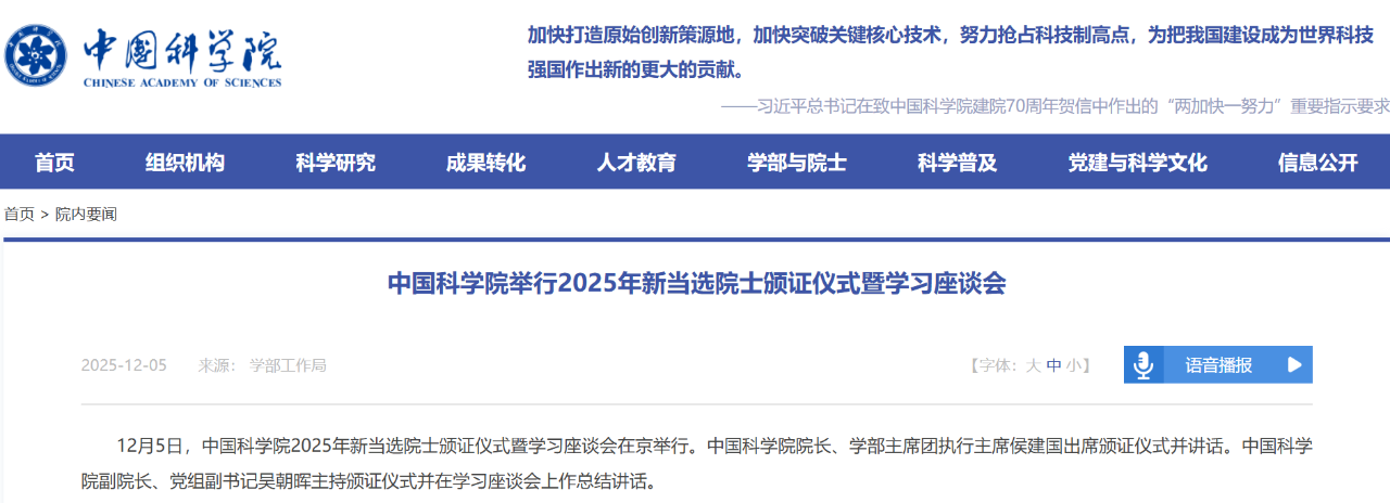 2025年12月5日,中国科学院、中国工程院分别举办2025年当选院士颁证仪式,为2025年新当选院士颁发了院士证书。