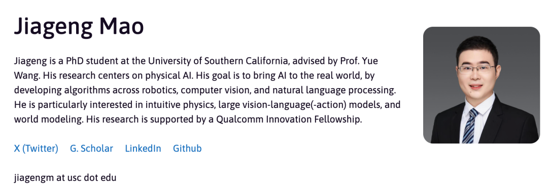 Jiageng Mao是南加州大学的博士生,师从Yue Wang教授。他的研究核心在于物理人工智能(Physical AI),致力于通过利用互联网规模数据中的多样化先验知识,解决复杂的物理世界问题。他的目标是为现实世界中的具身智能体(Embodied Agents)开发稳健且可泛化的智能系统,研究涵盖了自动驾驶、计算机视觉和机器人学习等前沿领域。