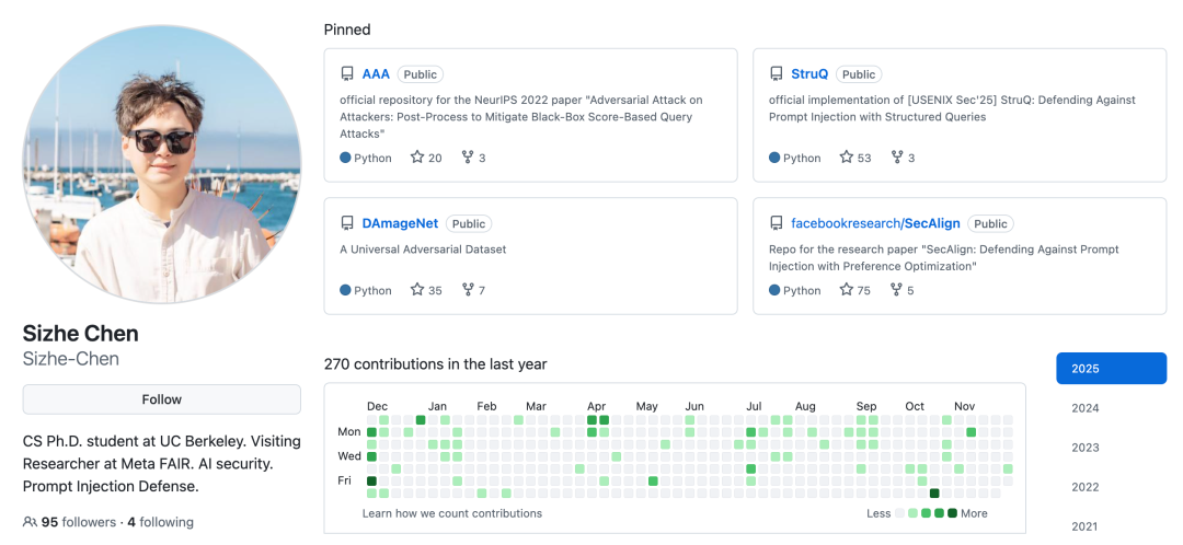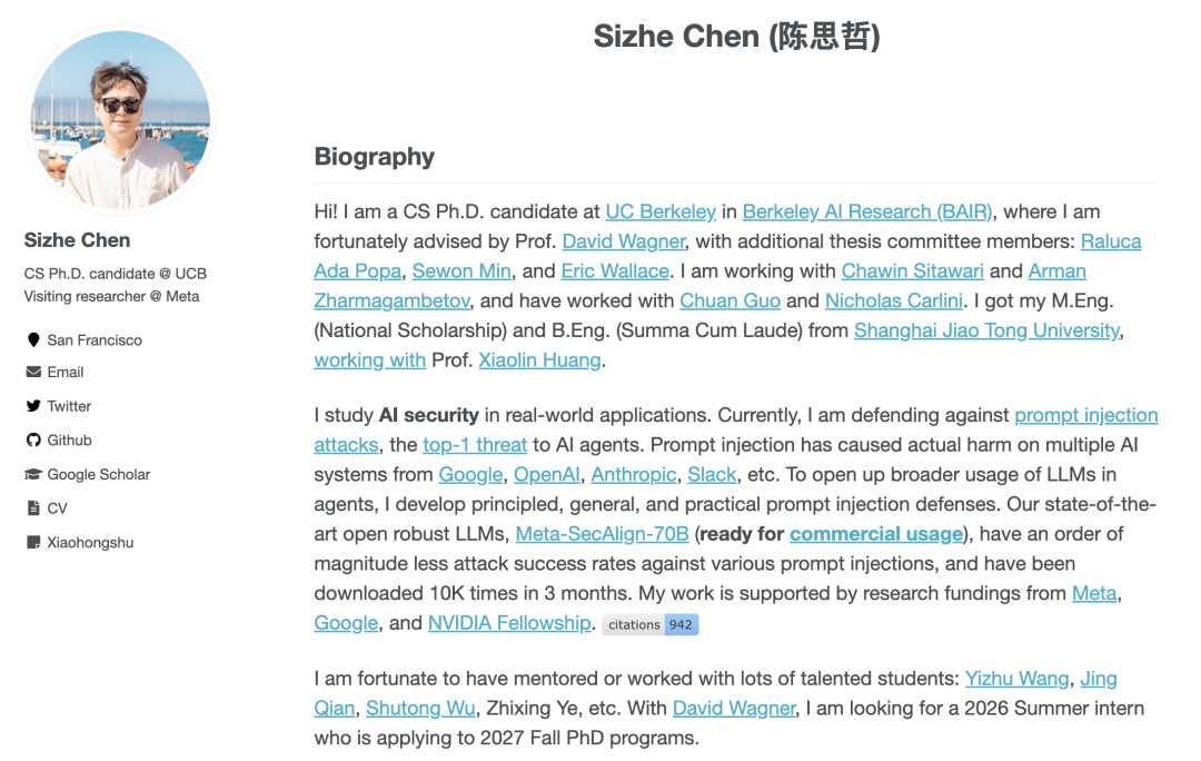 Sizhe Chen致力于人工智能安全领域的研究,重点关注现实场景中的模型防御机制。他目前的研究聚焦于大语言模型(LLM)和智能体(Agents)的安全性,特别是如何通过通用且实用的防御手段(如结构化查询防御)来保护智能体免受提示注入等攻击,同时确保智能体在执行任务时的功能完整性。