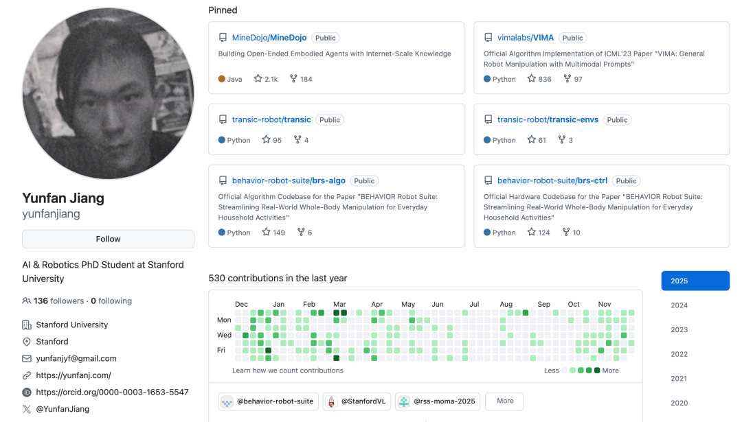 Yunfan Jiang是斯坦福大学计算机科学系的博士生,导师是李飞飞(Fei-Fei Li)教授。他的研究目标是构建通用的机器人系统,使其能够执行复杂的日常任务。他通过融合现实世界的全身操控数据、大规模仿真环境(如Minecraft)以及互联网级的多模态监督数据,开发可扩展的方法来训练具备高度适应性的机器人智能体。