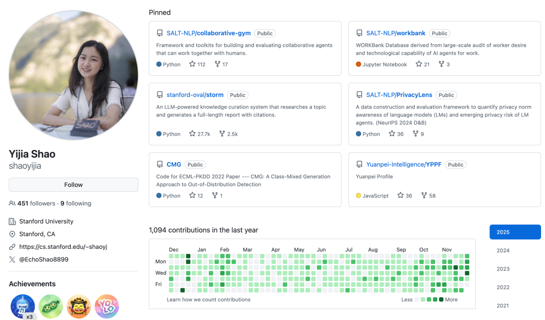 Yijia Shao是斯坦福大学的博士生,师从Diyi Yang教授。她的研究重点是人机协同(Human-AI Collaboration)。她致力于开发能够在任务执行过程中与人类进行有效沟通和协作的AI智能体,并设计新型的人机交互界面。她的工作旨在探索AI如何通过理解人类意图和反馈,更好地辅助人类完成复杂的知识密集型任务。