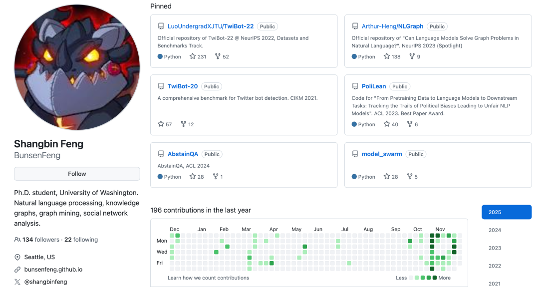 Shangbin Feng是华盛顿大学的博士生,导师是Yulia Tsvetkov。他的研究愿景是推动「模型协作」,即让多个在不同数据上由不同人员训练的机器学习模型能够相互协作、组合与互补。他致力于构建一个开放、去中心化且协同化的AI生态系统,解决单一模型在知识覆盖和隐私保护方面的局限性。