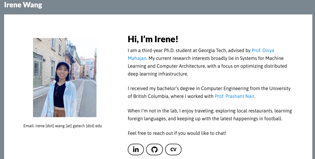 Irene Wang是佐治亚理工学院的博士生,导师是Divya Mahajan。她的研究致力于解决大规模AI训练中的效率与可持续性问题。她开发了集成加速器架构、网络拓扑与运行时调度的协同设计框架(Co-design Frameworks),旨在优化分布式深度学习系统的性能和能效,推动绿色AI计算的发展。