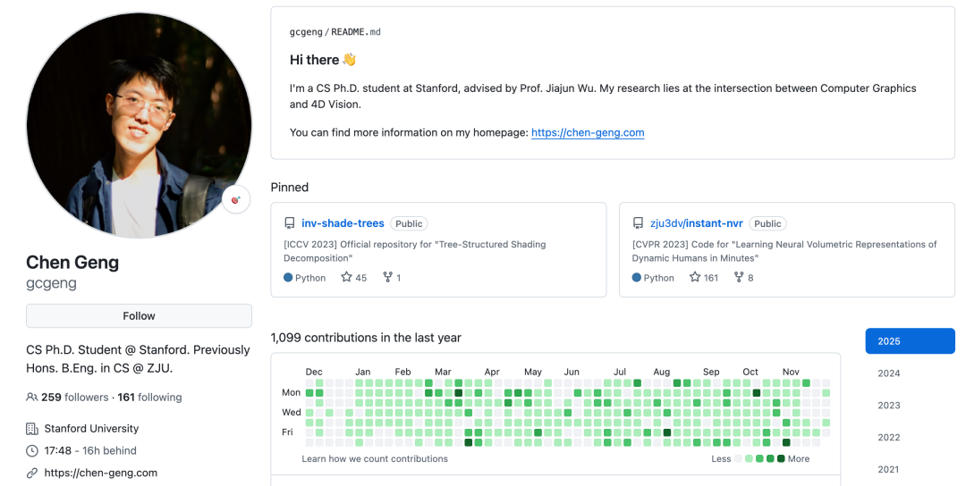 Chen Geng是斯坦福大学的博士生,导师是Jiajun Wu。他的研究兴趣位于计算机图形学与4D视觉的交叉点。他致力于利用可扩展的数据驱动算法和物理启发原理,对四维物理世界进行建模。他的工作推进了面向机器人与科学应用的物理基础三维与四维世界模型(World Models),特别是在动态场景的生成与理解方面。