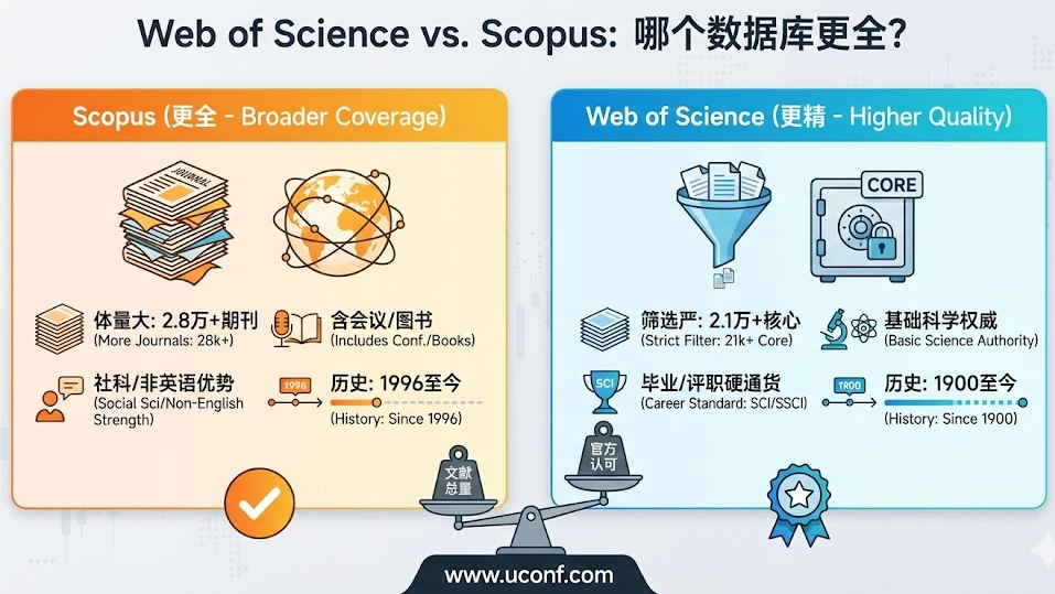 如果不差钱(学校都买了),建议“双修”。先用 Scopus 进行广撒网(Broad Search),再用 Web of Science 筛选出核心高质量文献(Deep Analysis)。