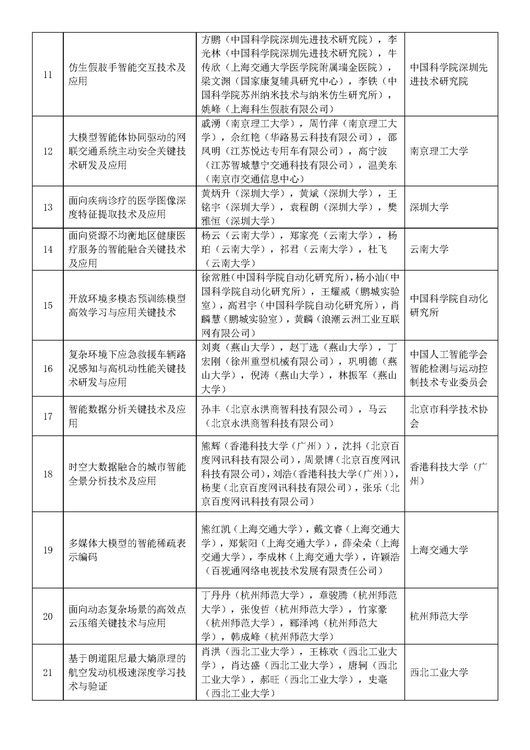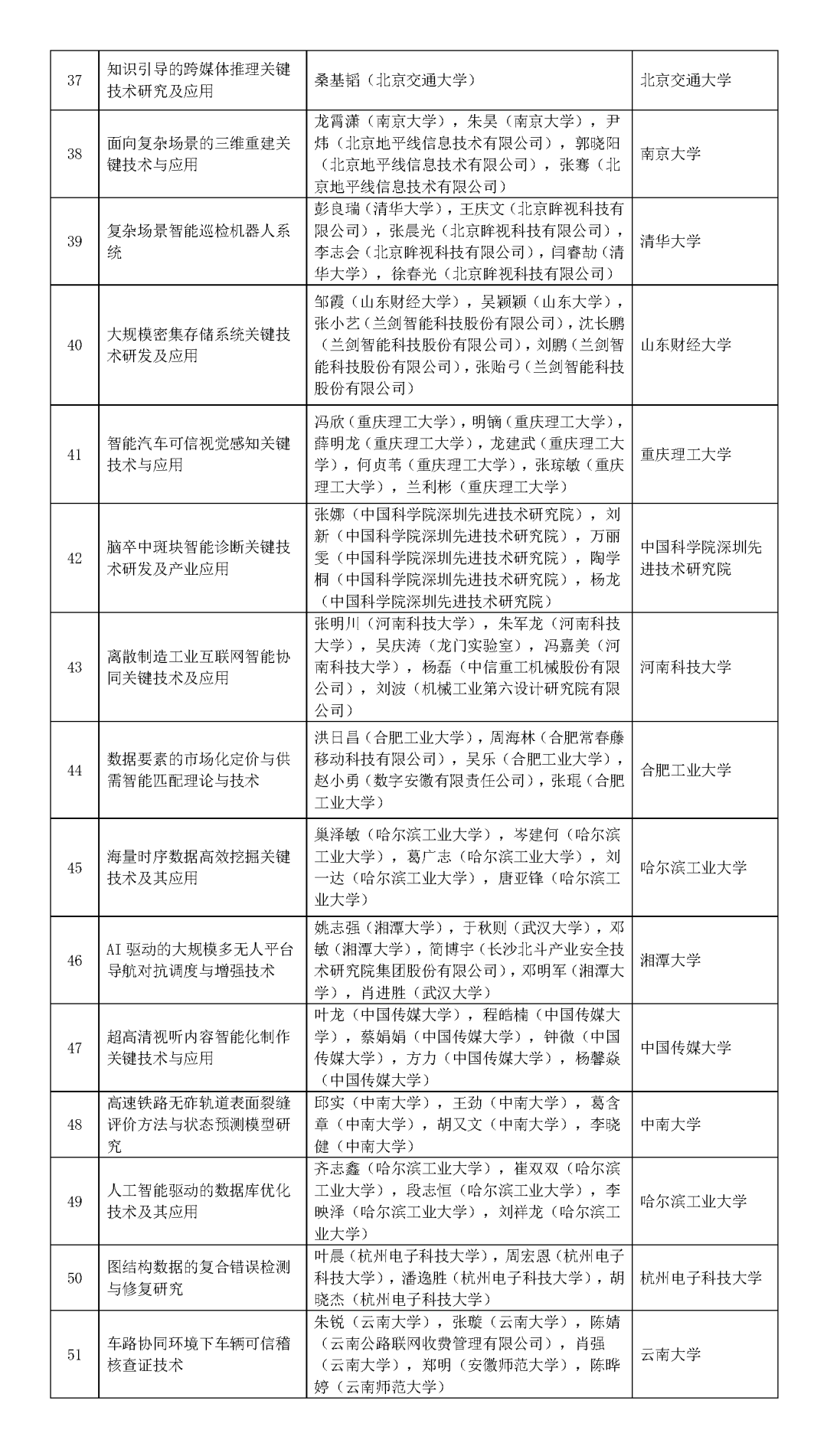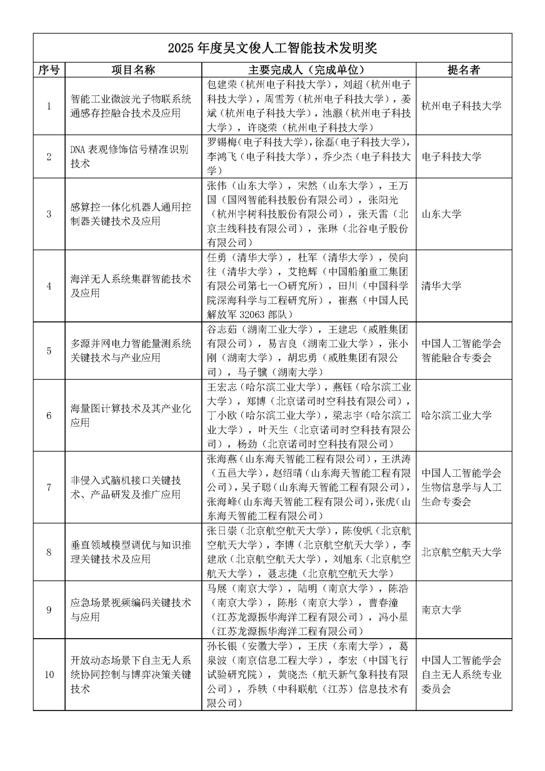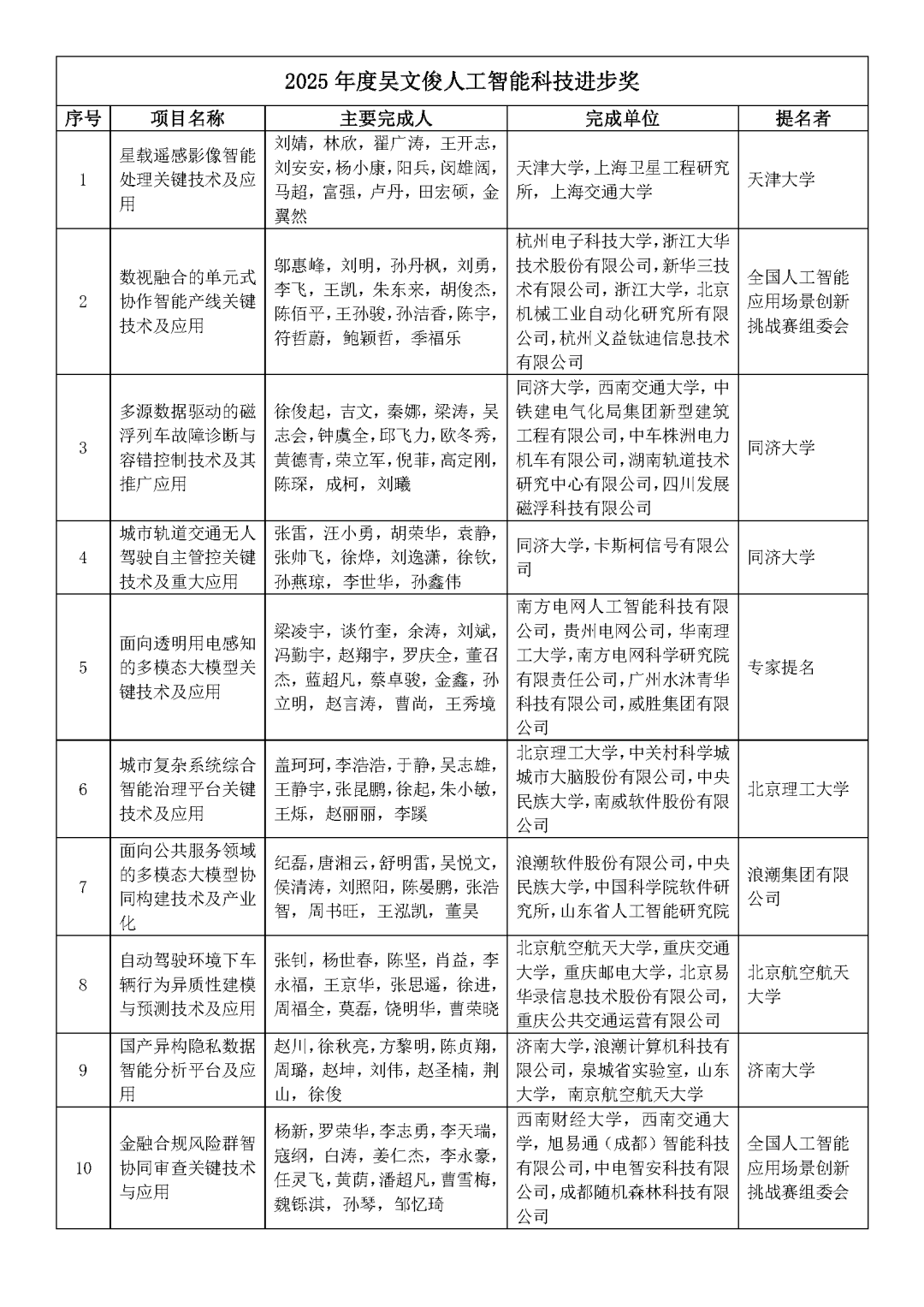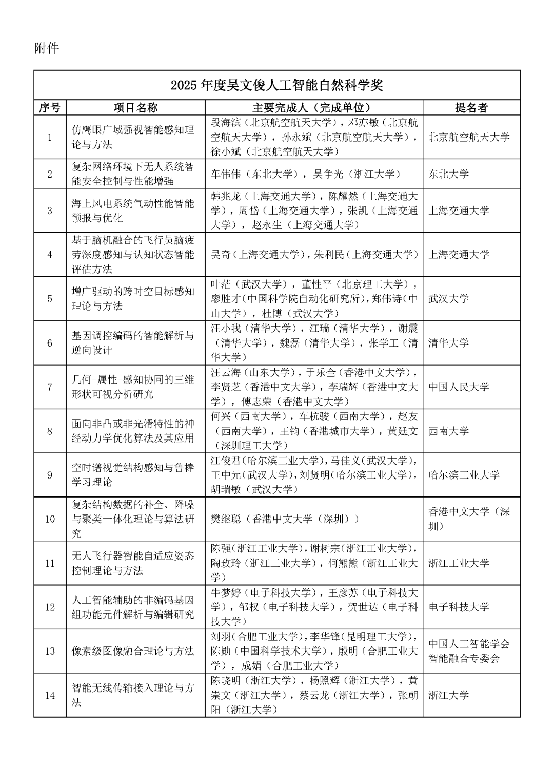 根据《吴文俊人工智能科学技术奖励章程》《吴文俊人工智能科学技术奖励实施细则》等相关工作要求,中国人工智能学会吴文俊人工智能科学技术奖励工作办公室组织对提名材料进行了形式审查,108项自然科学奖、51项技术发明奖、138项科技进步奖以及7项科技贡献奖、109项青年科技奖通过了形式审查。现将通过的自然科学奖、技术发明奖与科技进步奖的项目信息予以公示,详见文末附件(项目排序不分先后)。