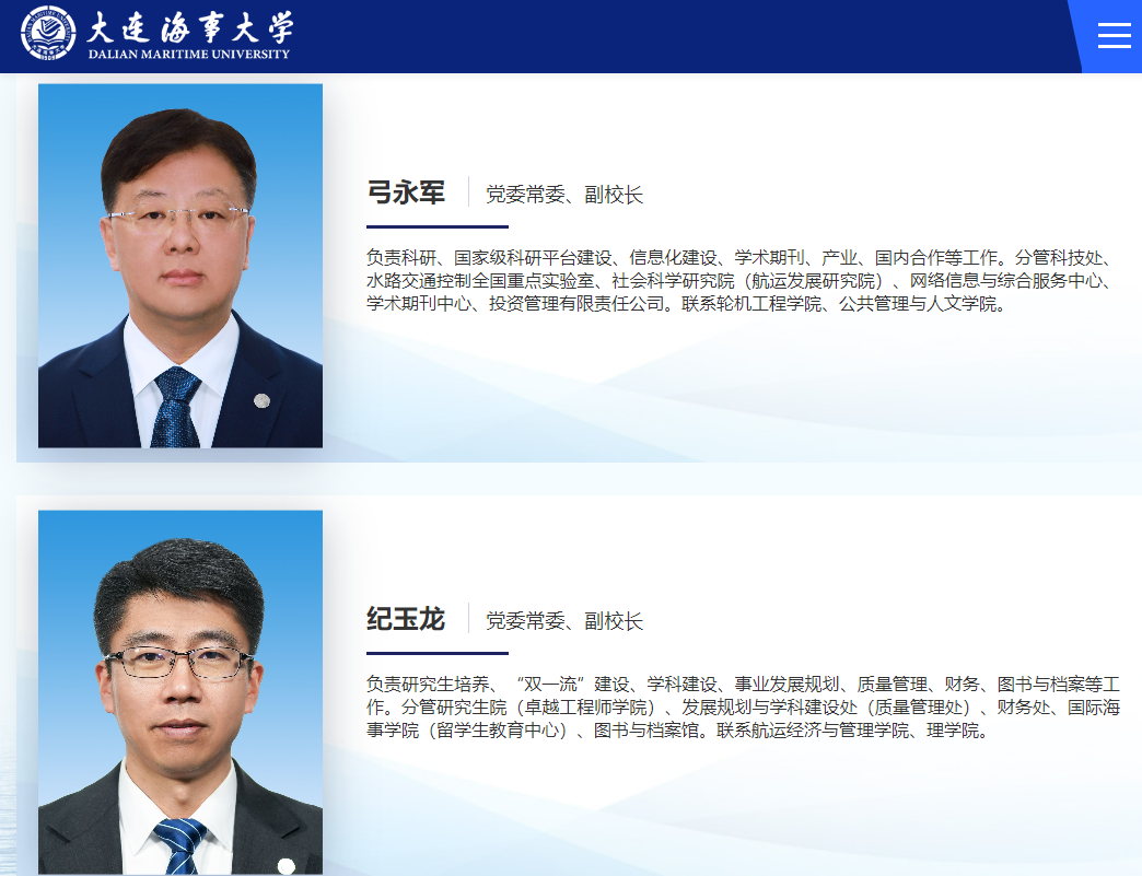 近日,大连海事大学官网“现任领导”一栏更新后显示,弓永军、纪玉龙已任大连海事大学党委常委、副校长。