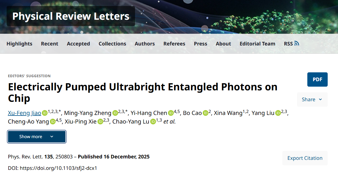 Xu-Feng Jiao, et al. "Electrically Pumped Ultrabright Entangled Photons on Chip." Physical Review Letters 135.24 (2025): 246302.