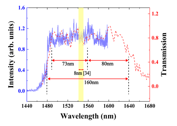 图2:垂直偏振光子的测量光谱(蓝色实线)以及TE-TM模式转换与合成的测量传输曲线(红色虚线)。
