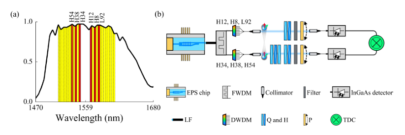 图3:(a) 标有三组选定频率通道的偏振纠缠光子源频谱。(b) 实验装置示意图。