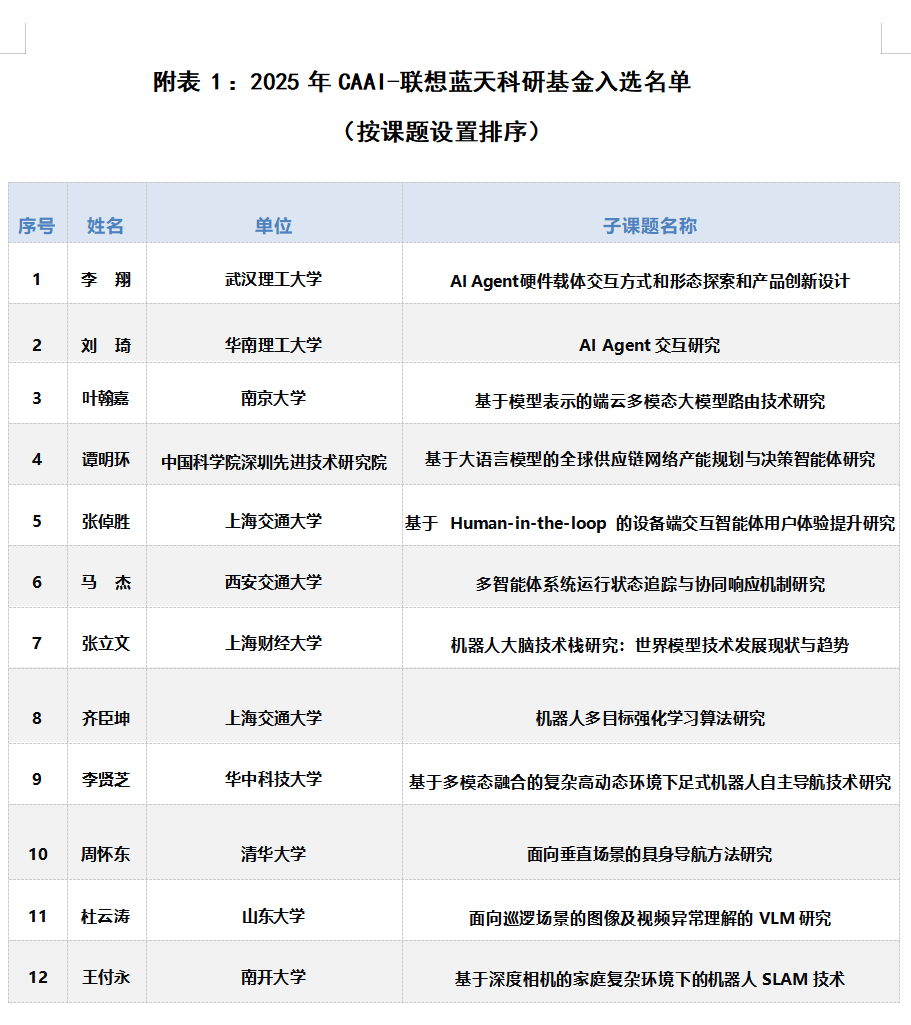 经资格审核、初评、终评,本年度共有12个项目入选。现将2025年CAAI-联想蓝天科研基金入选名单进行公示(见附表),公示期共3日(自2026年1月6日至2026年1月8日)。