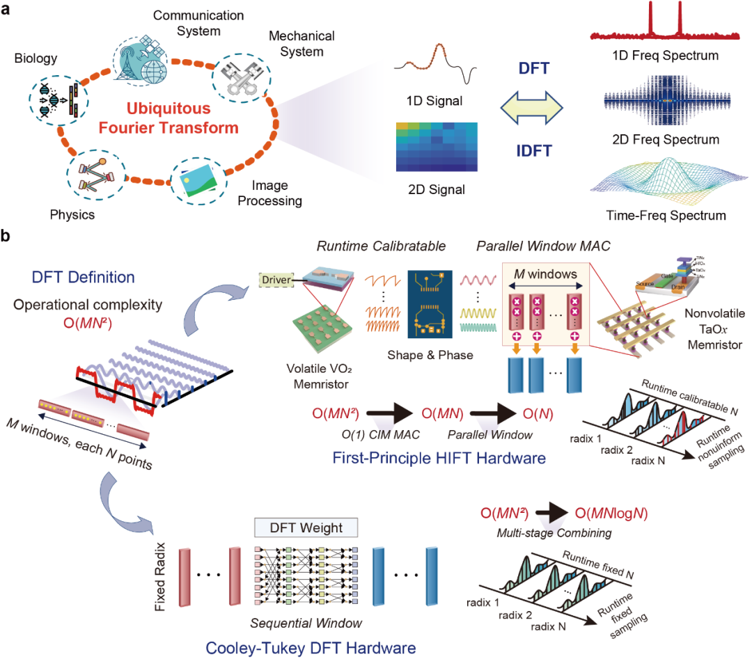 在此背景下,北京大学信息工程学院杨玉超教授、人工智能研究院陶耀宇研究员团队科研团队在国际上首次实现了基于忆阻器异质集成架构的第一性原理傅里叶变换系统(Hetero-Integrated Fourier Transform, HIFT),提出了一种全新的、融合易失型与非易失型忆阻器的高通量频谱计算体系结构。该研究从物理层面重新定义了傅里叶变换的计算机制,实现了在同一硬件平台上对任意基数、均匀或非均匀离散傅里叶变换的统一支持,标志着傅里叶变换硬件体系从算法驱动走向材料与物理原理驱动的重大跨越。