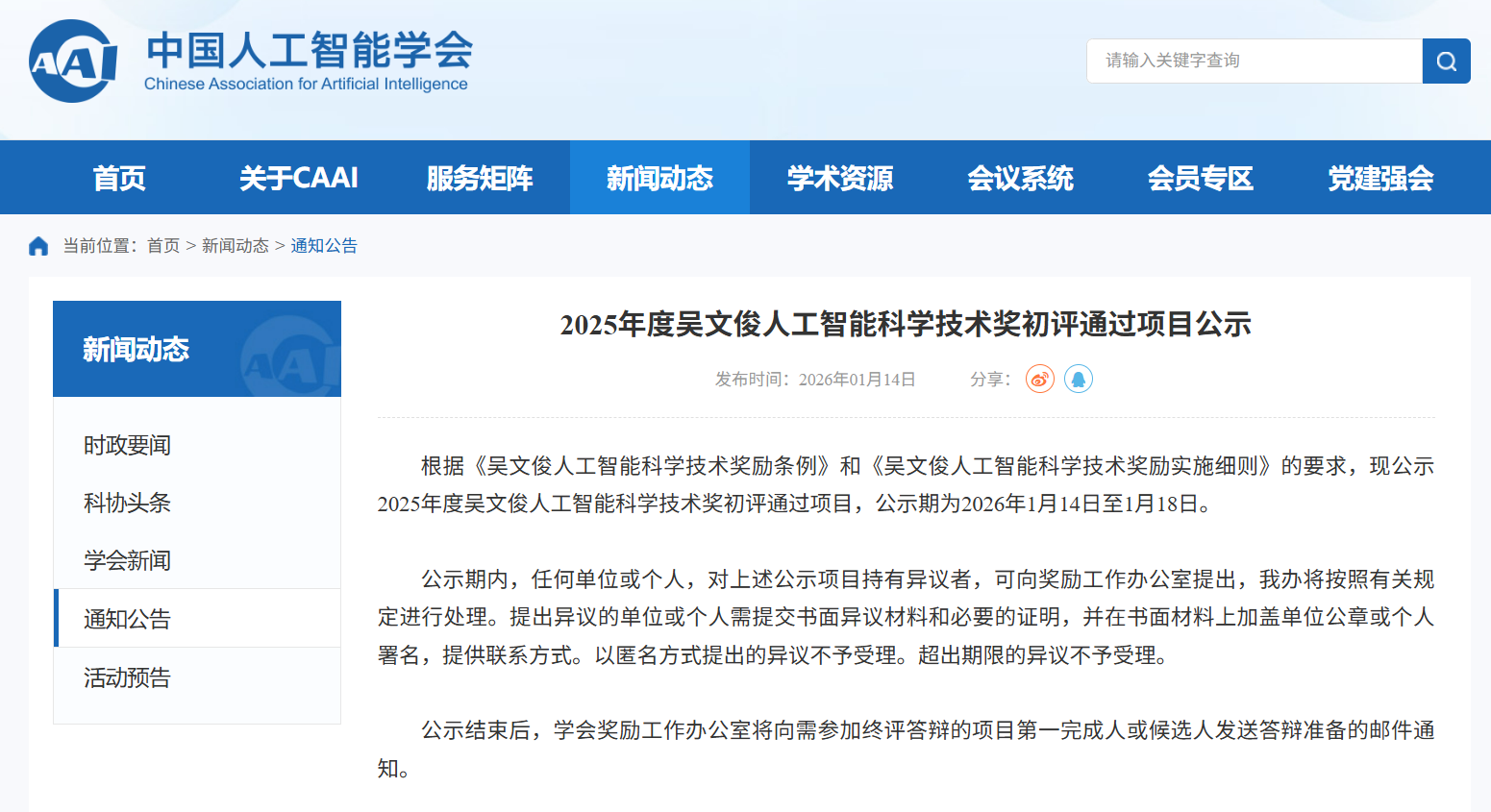 1月14日,中国人工智能学会发布《2025年度吴文俊人工智能科学技术奖初评通过项目公示》。根据《吴文俊人工智能科学技术奖励条例》和《吴文俊人工智能科学技术奖励实施细则》的要求,现公示2025年度吴文俊人工智能科学技术奖初评通过项目。