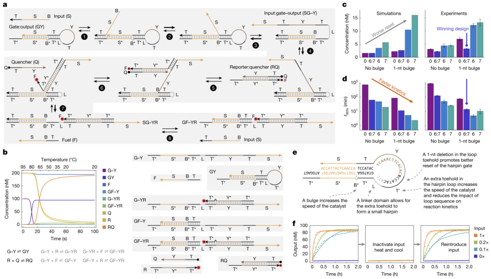 研究人员首先提出了“热驱动可重用分子电路”的核心概念(图1)。与一次性电路不同,可重用电路通过引入强而灵活的链间连接,使分子在加热后冷却时能够重新形成动力学陷阱,从而复位至初始状态。在DNA层面,他们设计了一种发夹结构门控机制,输入可催化输出释放,而热循环则能重置系统,使其准备好响应新一轮输入。
