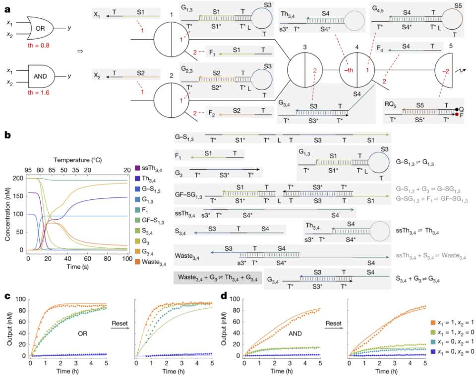 图5 | 可重用逻辑门。 a. 带信号恢复的双输入逻辑门实现。 b. 复位反应与模拟。 c,d. OR门与AND门在复位前后的模拟与实验。