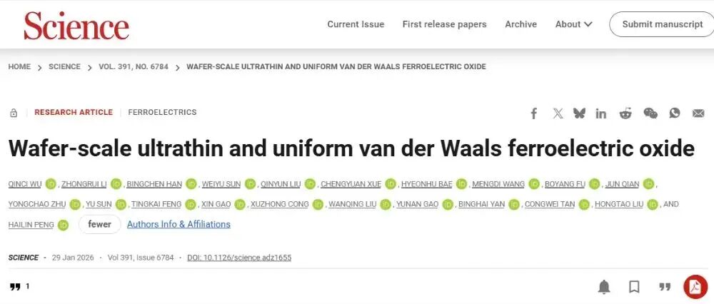 1月30日,北京大学彭海琳教授和刘洪涛研究员团队通过原位可控氧化二维半导体 Bi₂O₂Se,在 400 °C 以下直接生长出超薄、均匀的范德华铁电氧化物 α-Bi₂SeO₅。该材料在单层厚度下仍保持稳定铁电性,且天然具备无悬挂键、原子级平整界面,可与二维半导体无缝集成。基于这一材料体系,团队在晶圆尺度上构建了 Bi₂SeO₅-Bi₂O₂Se 铁电晶体管阵列,实现0.8 V超低工作电压、20 ns 写入速度以及超过 1.5×10¹² 次循环寿命,多项指标刷新二维 FeFET 纪录,为低功耗存算一体和三维集成芯片提供了关键材料基础。相关成果以“Wafer-scale ultrathin and uniform van der Waals ferroelectric oxide”为题发表在《Science》上。武钦慈、李忠睿、韩秉辰、孙玮玉、Qinyun Liu和薛骋远为共同第一作者。