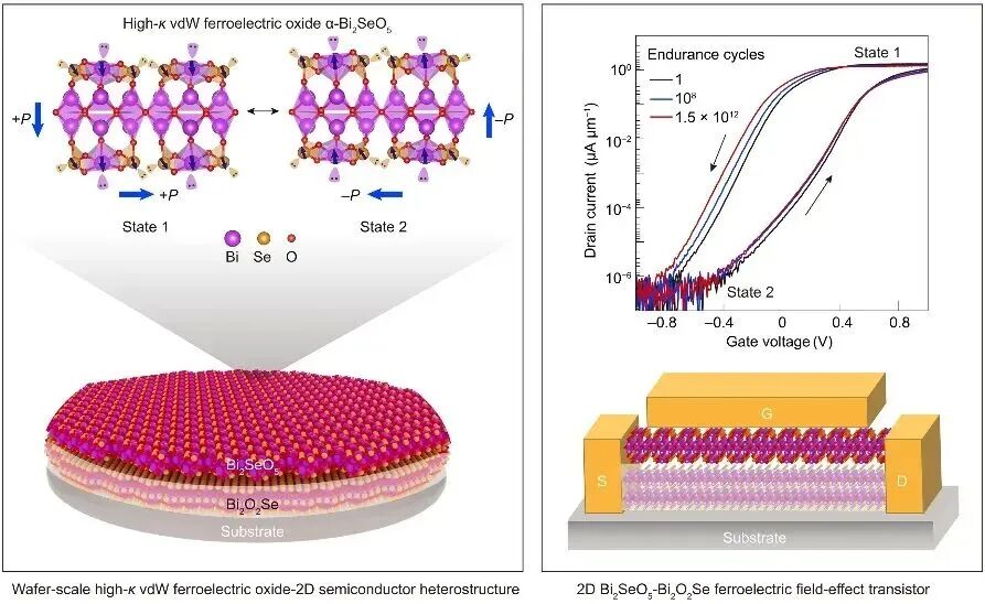 北京大学彭海琳教授和刘洪涛研究员提出了一条全新的解决路径:通过原位可控氧化二维半导体 Bi₂O₂Se,在 400 °C 以下直接生长出超薄、均匀的范德华铁电氧化物 α-Bi₂SeO₅。该材料在单层厚度下仍保持稳定铁电性,且天然具备无悬挂键、原子级平整界面,可与二维半导体无缝集成。基于这一材料体系,团队在晶圆尺度上构建了 Bi₂SeO₅-Bi₂O₂Se 铁电晶体管阵列,实现 0.8 V 超低工作电压、20 ns 写入速度以及超过 1.5×10¹² 次循环寿命,多项指标刷新二维 FeFET 纪录,为低功耗存算一体和三维集成芯片提供了关键材料基础。