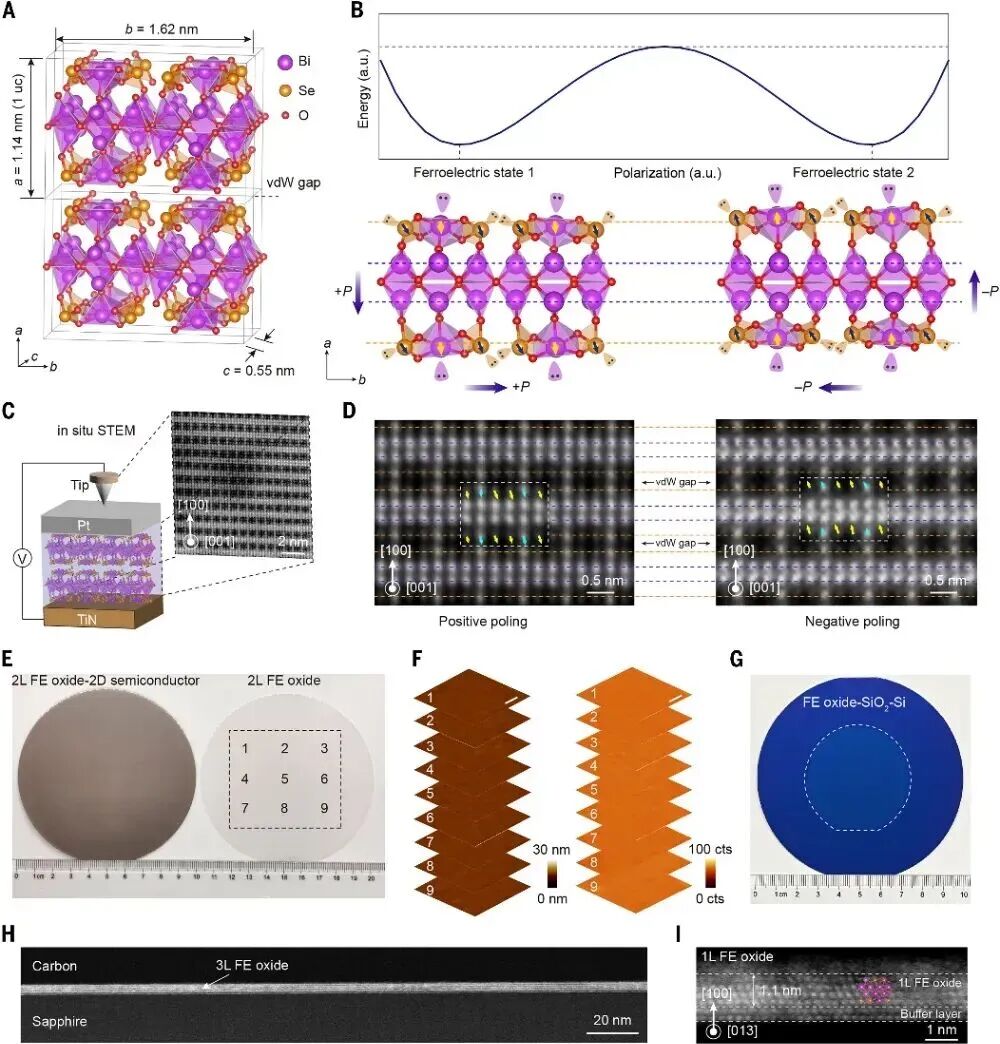在材料制备层面,团队提出了一种“以半导体为模板”的原位氧化策略。首先通过化学气相沉积在蓝宝石基底上制备大面积二维Bi₂O₂Se 薄膜,随后在 320–400 °C 条件下进行逐层氧化,使其转化为厚度可控的 Bi₂SeO₅-Bi₂O₂Se 异质结构(图1e)。这种方法避免了传统转移或原子层沉积带来的界面损伤,使铁电层与半导体通道之间形成原子级连续、平整的本征界面。AFM 与二次谐波成像结果显示,4 英寸晶圆范围内厚度波动低于 5%(图1f),为大规模器件一致性打下基础。