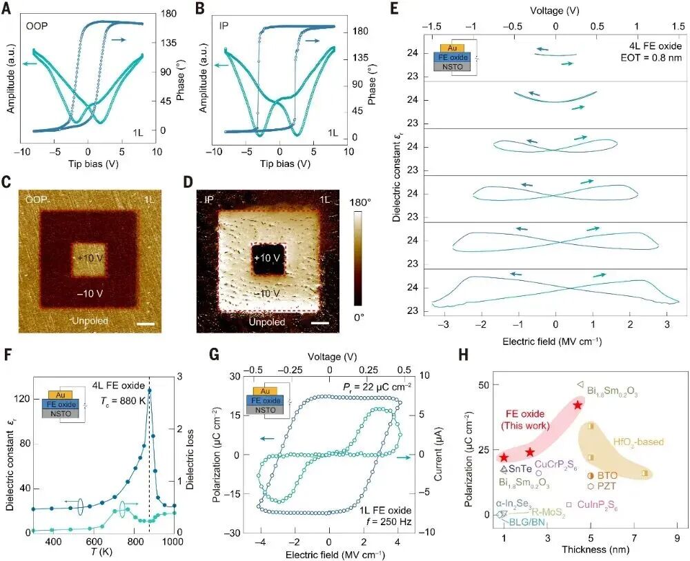 在铁电性能表征中,单层Bi₂SeO₅ 即展现出同时存在的面外与面内铁电性。压电力显微镜测量得到清晰的翻转回线与畴结构写入结果(图2a–d),且在不同衬底上重复实验均表现稳定,说明其铁电性不依赖特定界面。更重要的是,该材料几乎不存在“临界厚度”效应,从单层到多层,剩余极化值变化极小(图2h),这一特性在已报道铁电体系中极为罕见。宏观电学测试进一步凸显了 α-Bi₂SeO₅ 的优势。电容-电压测试显示其介电常数约为 24,居于二维铁电材料前列(图2e),居里温度高达 880 K(图2f),意味着器件在高温工况下仍能稳定工作。通过抑制漏电流的 PUND 测量,团队在单层样品中提取出高达 22 μC cm⁻² 的剩余极化和适中的矫顽场(图2g),性能全面超越多数超薄铁电体系。