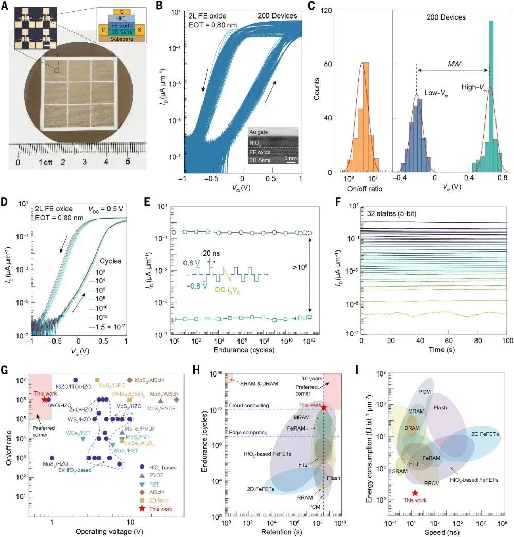 图3:晶圆级 FeFET 阵列的器件性能、低电压操作与超高循环寿命