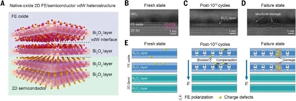 这种超强可靠性并非偶然。原子分辨电镜结果表明,即使经历万亿次翻转,Bi₂SeO₅-Bi₂O₂Se 界面仍保持完整(图4a–c)。理论计算揭示,界面处的 Bi₂O₂ 层可在翻转过程中实现自发电荷补偿,抑制缺陷累积(图4e),从根源上避免了传统 FeFET 中常见的疲劳失效机制。