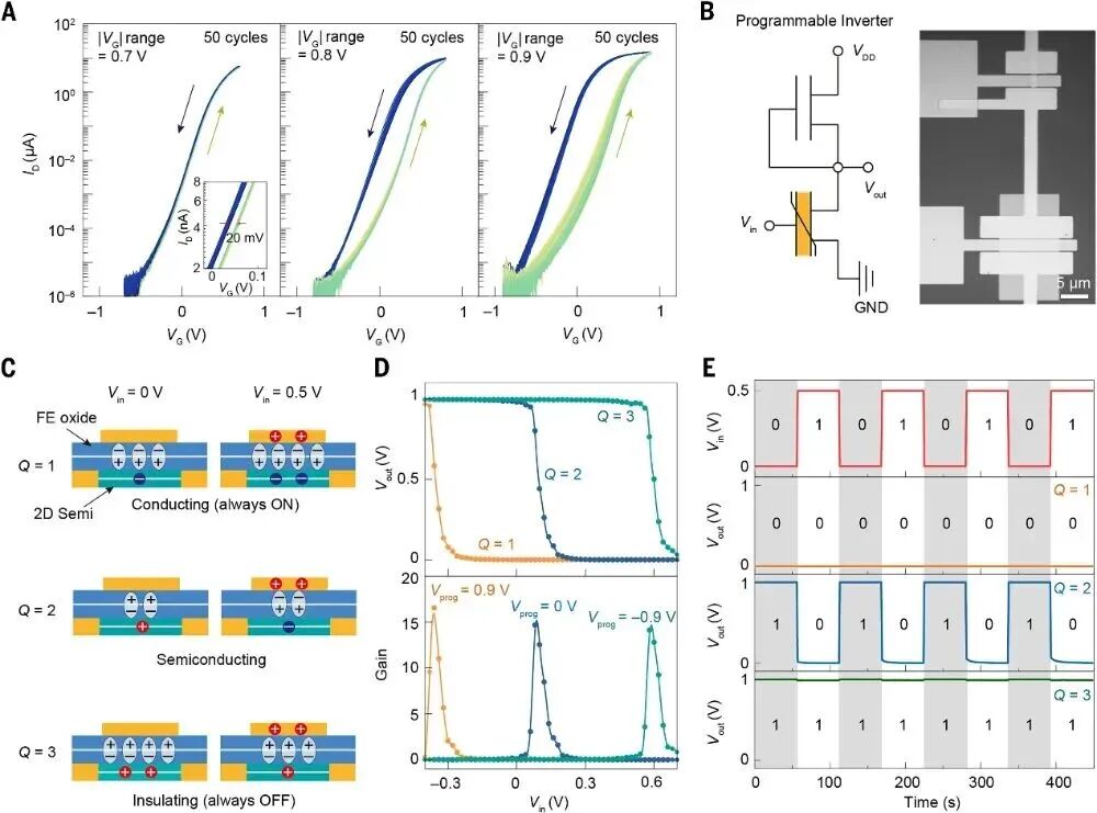 在电路层面,研究进一步展示了该体系在低功耗逻辑-存储融合中的潜力。通过调控极化状态,同一FeFET 可在“普通晶体管”与“非易失存储单元”之间自由切换,构建出亚 1 V 工作的可重构逻辑-存储反相器(图5)。器件不仅能记忆逻辑状态,还可在不刷新条件下完成逻辑运算,展现出面向边缘计算与类脑计算的应用前景。