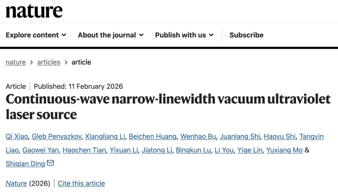 相关研究成果于北京时间2月12日以《连续波窄线宽真空紫外激光光源》(Continuous-wave narrow-linewidth vacuum ultraviolet laser source)为题在线发表于《自然》(Nature),美国物理学会旗下Physics杂志同期在Viewpoint栏目刊发评论文章专题解读。