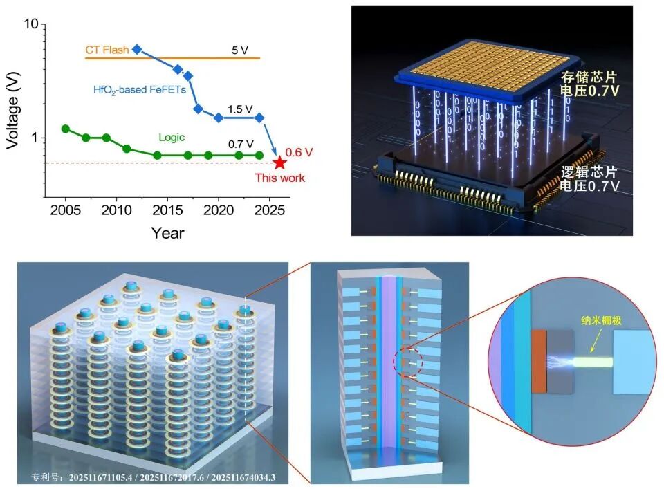 文章截图逻辑器件和存储器件是构建集成电路的两大底层元器件。逻辑单元构成芯片的“运算与控制中枢”,存储单元构成芯片的“数据仓库”,两者占集成电路市场规模的70%以上。在摩尔定律的驱动下,逻辑晶体管通过制程微缩和架构迭代,性能不断提升,当前业界已实现2纳米节点逻辑芯片量产,并且CMOS晶体管在0.7V的低电压下工作。然而相比之下,非易失性存储器几十年来性能发展相对滞后,主流的非易失性Flash存储技术难以微缩到先进节点;最为关键的是,Flash存储需要在5V以上高电压下完成数据擦写。因此,现有芯片必须在逻辑单元和非易失存储之间集成升降压电路以完成工作电压转换,这带来了额外面积开销、能耗增加等一系列问题。更为重要的是,现代AI芯片架构的核心在于数据流优化,逻辑和存储之间的电压不匹配直接导致数据交互不畅通,严重拖累了AI芯片算力,并大幅增加了能耗。