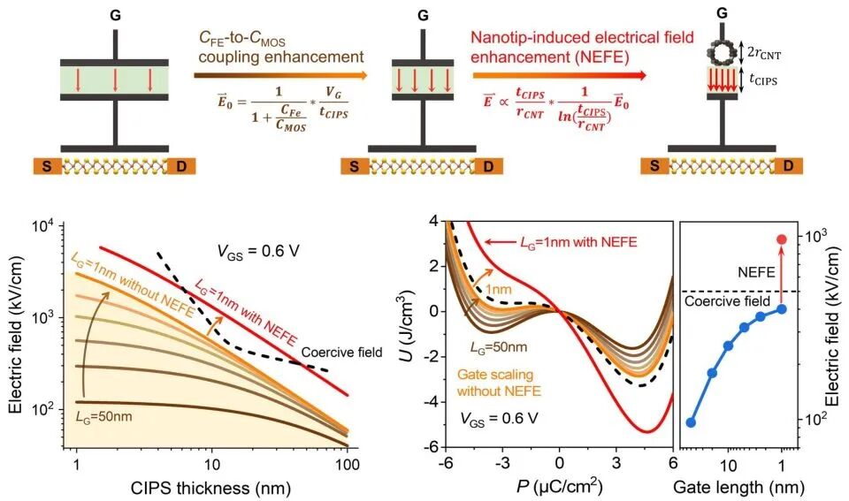 在本工作中,邱晨光-彭练矛团队首次提出“纳米栅铁电晶体管结构”和“纳米栅极电场增强机理”。通过优化器件结构,巧妙地将栅电极尺寸缩小到纳米极限尺度。利用纳米栅的尖端电场汇聚效应,在铁电层中构建了高度局域化的强电场汇聚区,有效地放大了局部电场强度,大幅降低铁电极化翻转电压,超越了常规平板铁电体的矫顽电压极限,打破了“低电压与高矫顽电场不可兼得”的固有认知,实现了0.6V超低工作电压,将铁电存储电压降低到和逻辑电压相当水平。研制的铁电晶体管能耗水平低至0.45 fJ/μm,领先国际已有报道一个数量级,存储速度接近1纳秒。该研究在国际上首次发现铁电晶体管具有反常的尺寸微缩优势,即物理栅长微缩到极限1纳米时显著汇聚并增强了电场,极小栅极尺寸有效改善了铁电存储特性,充分表明铁电存储器在构建未来亚纳米节点芯片具有显著优势。