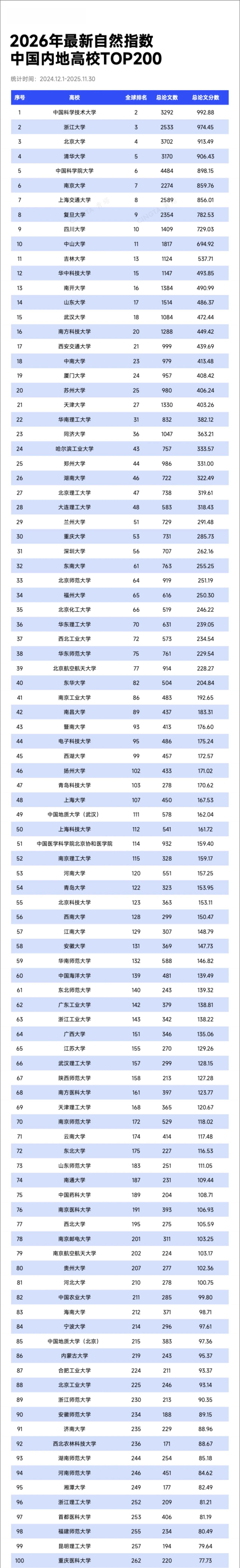 近日,自然指数官网更新了最新的自然指数排名(统计时间节点为2024.12.1-2025.11.30)。