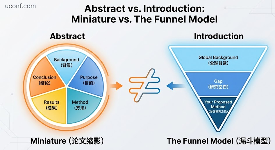 对于初学者来说,摘要和引言看起来都在“介绍”论文,但实际上它们在论文中扮演着截然不同的角色。简单来说:摘要是整篇论文的“缩影”,而引言是正文的“开端”。