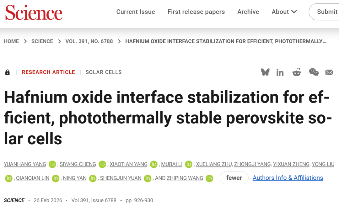 2026年2月27日,武汉大学物理科学与技术学院王植平团队在Science在线发表题为“Hafnium oxide interface stabilization for efficient, photothermally stable perovskite solar cells”氧化铪界面稳定策略实现高效、光热稳定的钙钛矿太阳能电池 的研究论文。研究提出一种原子尺度界面键合技术,成功解决了钙钛矿太阳能电池效率与稳定性难以协同提升难题。
