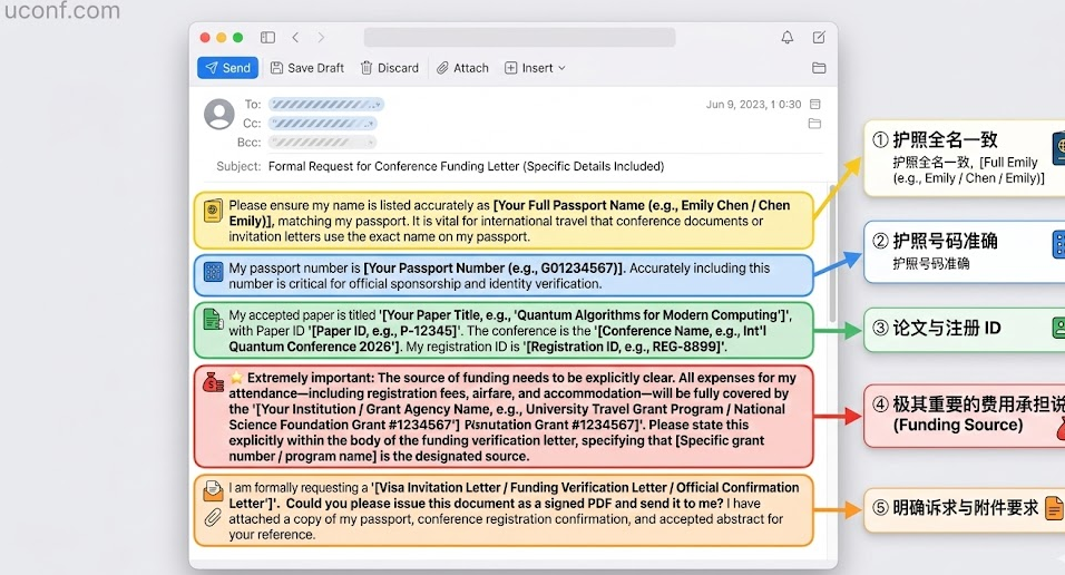 Funding Source (资金来源说明):这是极易被忽略的一点!签证官非常看重你的差旅费谁出。你需要在邮件中明确告知组委会你的资金保障,以便他们写进邀请函里。