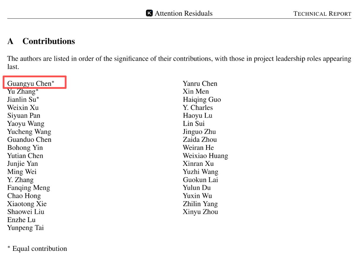 论文作者是来自月之暗面的数十名研究员,对项目贡献最突出的三位研究员分别是陈光宇、Yu Zhang以及 Jianlin Su。其中,值得注意的是,第一作者陈广宇是一名年仅 17 岁、加入团队仅 5 个月的高三学生,他虽然还未高中毕业,但已经从“学生”变成“一线贡献者”。