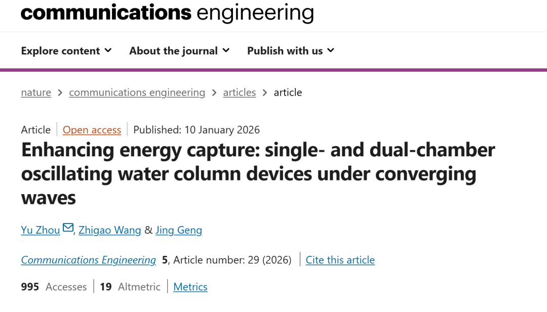 近日,哈工程船舶学院周宇、耿敬教授团队在Nature旗下首个工程领域子刊《Communications Engineering》发表重要研究成果,系统揭示了抛物线型聚能海岸与振荡水柱(Oscillating Water Column, OWC,一种将波浪能转换为电能的主流装置,简单来说就像“水下打气筒”,利用波浪上下运动压缩空气推动涡轮发电的设备)波能装置耦合下的能量传递与俘获机理,为解决我国近海波浪能流密度偏低的工程化利用难题提供了全新技术路径。