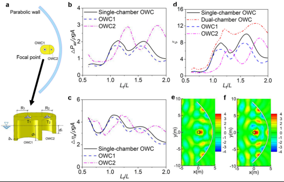 团队围绕抛物线聚能海岸耦合OWC装置在汇聚波场中的高效俘能问题,构建了基于势流理论的二阶时域高阶边界元数值模型,并结合模型试验分阶段验证了模型的准确性,建立了适用于不同尺度及多气室耦合条件的非线性气动模型,突破了传统依赖单一工况反复标定的局限,为后续同类研究提供了重要的方法支撑。