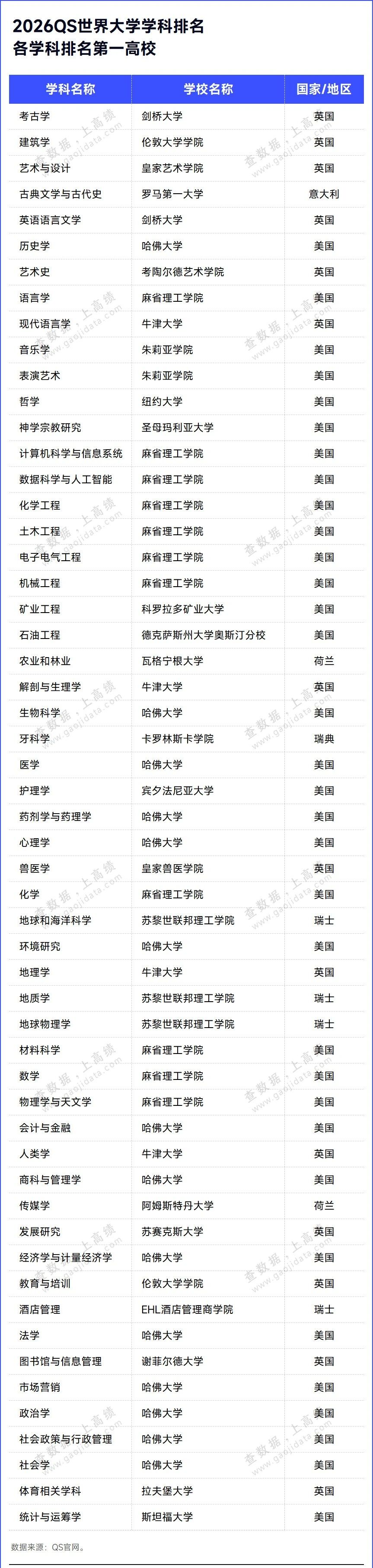 3月25日,2026QS世界大学学科排名发布。2026QS世界大学学科排名涵盖了来自100多个国家和地区的1900多所大学的21000多个学术项目,跨越55个学术分支和五大广泛的学术板块:艺术与人文、工程与技术、生命科学与医学、自然科学以及社会科学与管理。